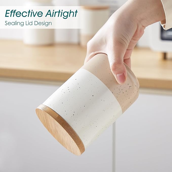 - 【High-quality Material】The canisters are made of high-quality stoneware, which is not easy to crack, and is more durable than plastic and glass. The lid is made of wood, with an environmentally friendly sealing rubber ring to improve the sealing. Effectively keep the items dry and fresh