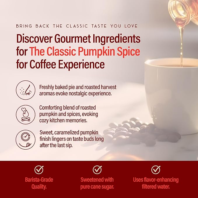 - HOT OR ICED COFFEE PUMPKIN SPICE YOUR WAY: Simply mix pumpkin spice drink syrup into hot or cold coffee for a comforting, rich taste. Fine-tune to your preferred balance of flavor and sweetness, then enjoy every sip.