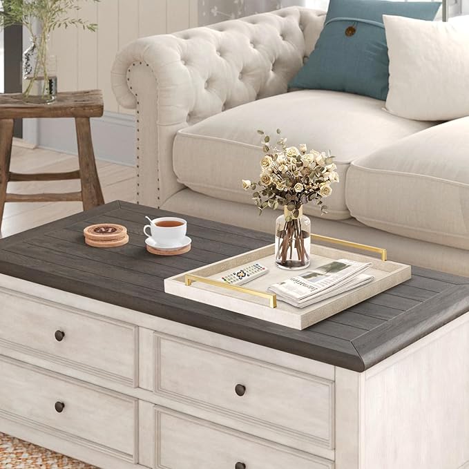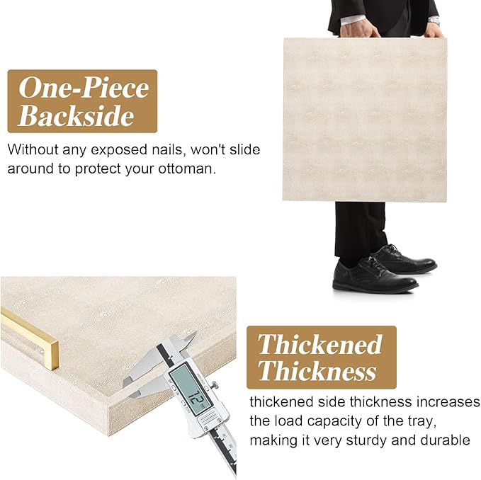 - Elevate your living space with our stunning large ottoman tray for coffee table. The square design and elegant brushed gold handles add sophistication and style to any room.