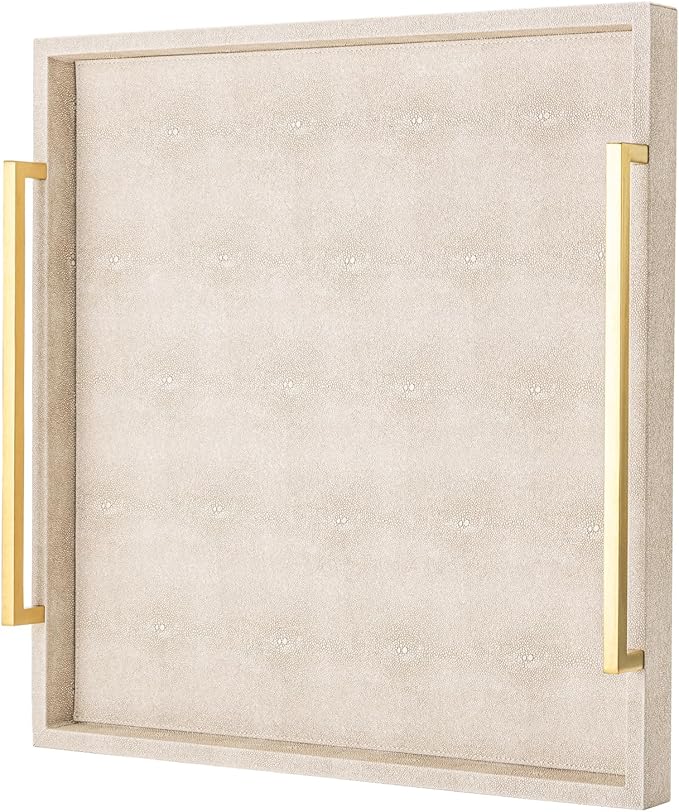 Large Ottoman Tray for Coffee Table,Square Shagreen Leather Decorative Tray with Gold Handles for Living Room Decor