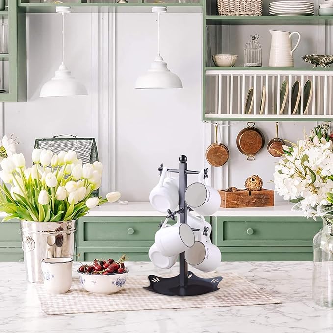 - Mug Storage Solution: This metal mug tree holds up to 6 large coffee or tea mugs, providing easy access while saving valuable countertop and cabinet space. Its compact and portable design allows you to move it effortlessly, keeping your coffee bar organized and your favorite mugs within reach. **Note: Mugs are not included**