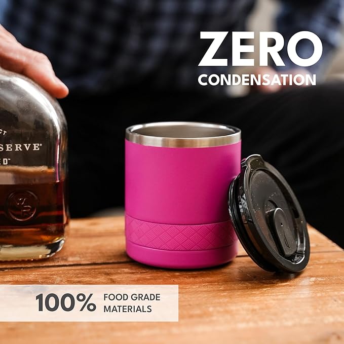 Elemental Recess Lowball Tumbler, 10oz Triple Wall Stainless Steel Cup with Non-Shattered Tritan Lid, Insulated Whiskey Glass, Insulated Coffee Tumbler Mug for Hot & Cold Drinks - Hot Pink