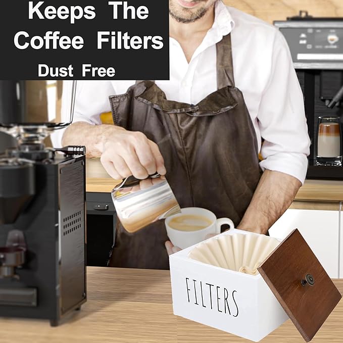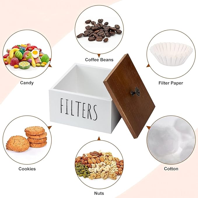 - ✔ Rustic Farmhouse Style - The perfect way to hide unsightly coffee filters without taking up space anymore, complements any countertop decor, matches your coffee bar. Classic white color and black letter "filters" match for a rustic vintage style for your coffee filter. This coffee filter container are made by hand, which means each piece will be unique.