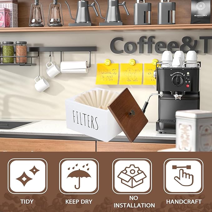 - ✔ Sturdy Coffee Bar Decor - Our coffee filter holder storage is made from wood, Smooth surface are straightforward to clean, wipe with a damp cloth. It is a nice decoration in your Kitchen Counter, coffee bar decor.