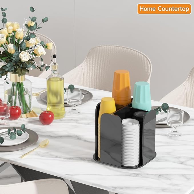 Beego Coffee Cup Holder Organizer - Rotatable 4 Compartments Black Acrylic Cup Dispenser Station With Lid Carousel - Countertop Plastic Cup Holder for Restaurant Breakroom Bar Accessories