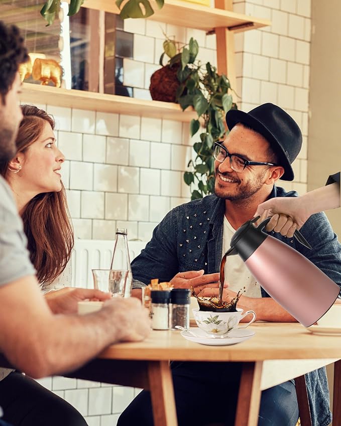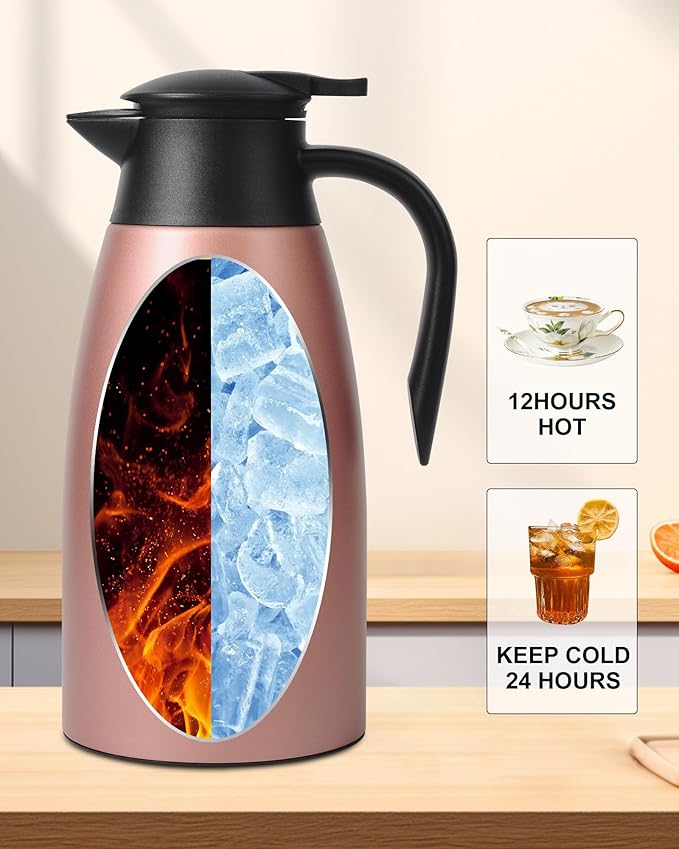 - 12HR HOT & 24HR COLD COFFEE THERMOS >>>> Our coffee carafe uses advanced double-wall vacuum insulated technology to lock in temperature for 12 hours hot or 24 hours cold. This 2 L capacity makes the large thermos for hot drinks perfect for cafes,Ideal used for bedside, restaurant, office, party, camping, travel sports games insulated coffee carafes