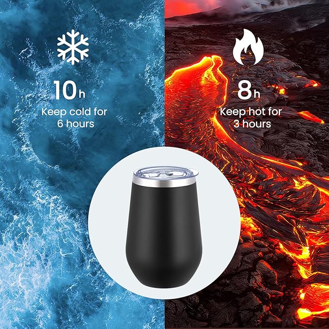 - [Thermal Insulation & Included Straw:]The double-wall wine tumbler uses a double-layer vacuum insulation process to maintain your drink's temperature for an extended period. It keeps your water, wine, or cocktail icy cold for up to 10 hours and your coffee or tea hot for over 8 hours. Additionally, the straw hole at the top of the cup with a slider and just because of the included straws, which make your drinking more convenient no matter leisure or occupied