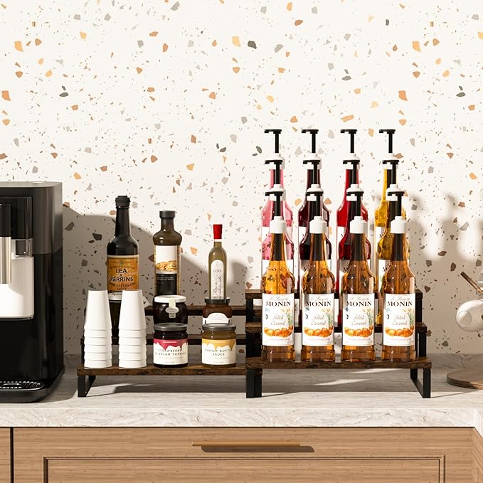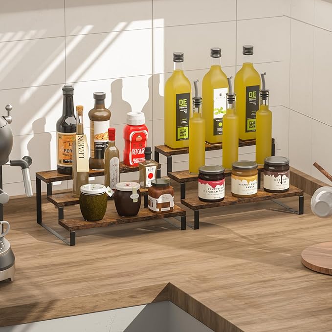 - Expandable Design: 3 Tier Expandable desiqn (Width expandable 13.8” to 26”) have plenty of clearance for different size bottles. You can combine the two racks to use for a shelf that fits vour storage space. You can also separate the spice racks for different places. The expandable feature of the display riser stands provide flexibility for your cabinet space