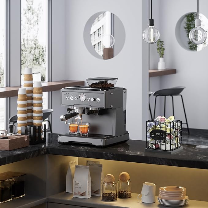 - ATTRACTIVE VINTAGE DECOR: Give your coffee bar a stylish upgrade with our coffee pod holder, crafted with frosted iron wire and rustic black wood panels for a touch of elegance. Ideal for any countertop in the kitchen or office
