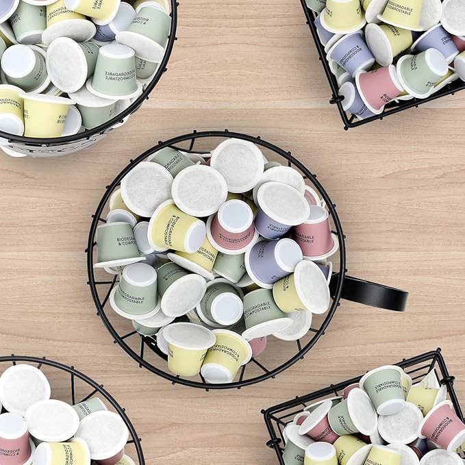 - ATTRACTIVE VINTAGE DECOR: Give your coffee bar a stylish upgrade with our coffee pod holder, crafted with frosted iron wire and rustic black wood panels for a touch of elegance. Ideal for any countertop in the kitchen or office