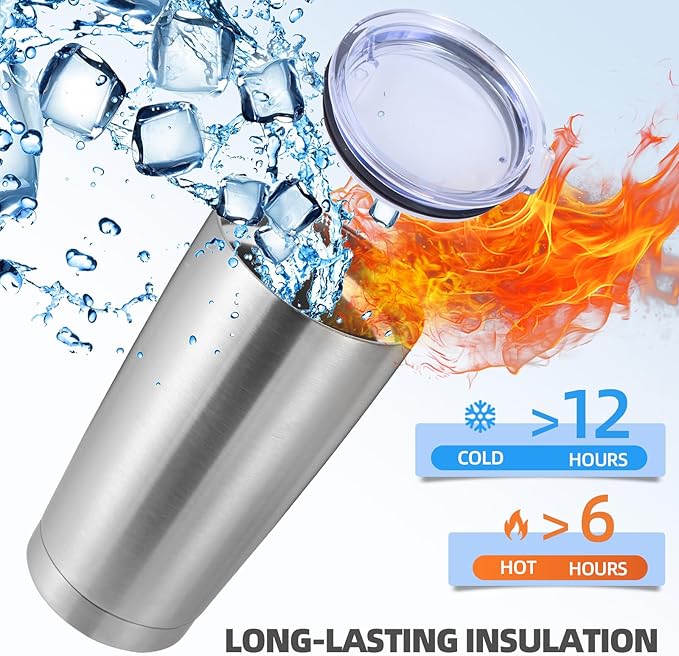Volhoply 20oz Stainless Steel Tumbler with Lid and Straw Bulk 12 Pack,Double Wall Insulated Travel Iced Coffee Mug Fits Cup holder,Powder Coated Cups for Hot/Cold Drinks,Christmas Gifts(Silver,12 Set)
