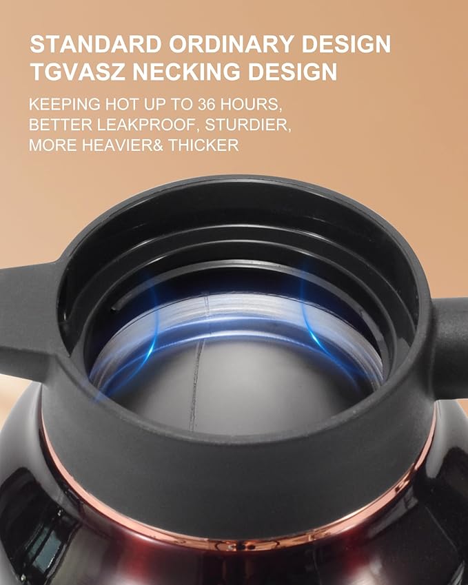 - LEEK PROOF DESIGN TEA THERMOS >>>> Our coffee dispenser lid with food safe silicone ring, which is leak proof and always locks into place when closing your pitcher! Effectively prevent water leaking. The tea flask looks perfect as we pay great attention to quality and detail.