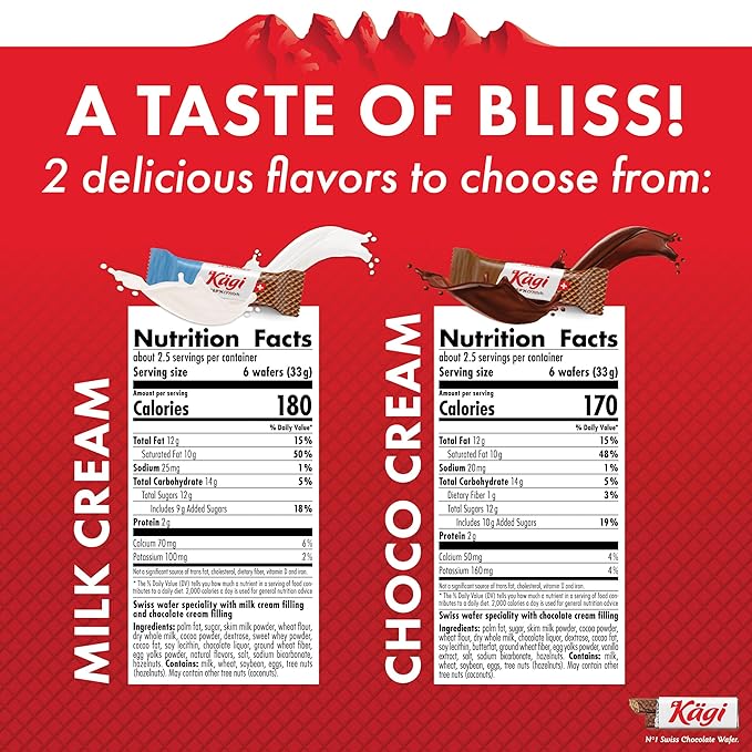 - CHOCOLATE WAFER PACK: Enjoy two delicious varieties of crispy, light wafers filled with creamy mousse - every Kägi wafer is a taste of bliss. This flavor pack Kägi Milk and Choco Crisp'n Cream Wafers are irresistibly luscious delights that everyone can enjoy! Surprise chocolate lovers with Kägi wafers as a special stocking stuffer, add it to gift baskets, or just enjoy a Kägi as an everyday treat.