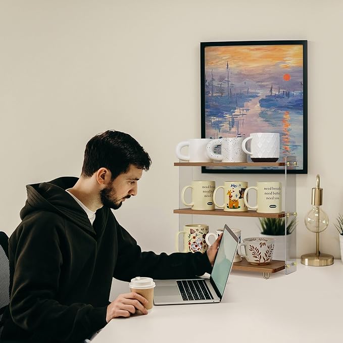 - Stylish Design: Featuring wavy acrylic side panels and a natural wood board. The sturdy construction ensures that it can hold the weight of multiple mugs without wobbling or tipping. this organizer presents an aesthetically pleasing texture, ideal for coffee bar enthusiasts and those who love to decorate their spaces.