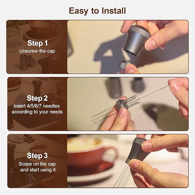- 【Needles Removable as you like】 Unlike many other espresso tools, our espresso distribution tool can be easily assemble/disassemble, you can insert as many 3/4/5/6/7 needles as you need