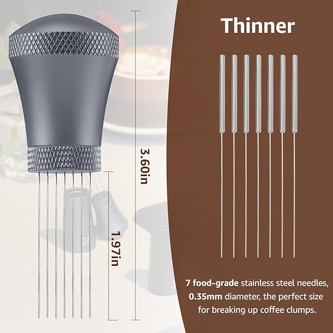 - 【Thinner 14 Needles】 Needles evenly distributed design. 7 food-grade stainless steel needles, 0.35mm diameter, the perfect size for breaking up coffee clumps, plus 7 replacement needles. Thoughtful needles storage tube. Say goodbye to the bent needles