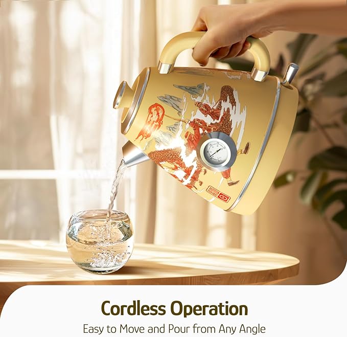 Hazel Quinn Retro Electric Kettle - 1.7 Liters / 57.5 Ounces Tea Kettle with Thermometer, All Stainless Steel, 1200 Watts Fast Boiling, BPA-free, Cordless, Automatic Shut Off - Dragon Dance