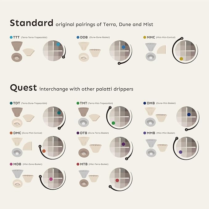 - Patented Modular Design for Unlimited Brewing Experiences: The modular wall and base split design allows you to create 11 unique combinations from Terra, Mist, and Dune, including configurations compatible with both basket and V60 filters. This versatility encourages experimentation with different flow rates, extraction times, and brewing techniques, empowering you to discover new possibilities in every cup.