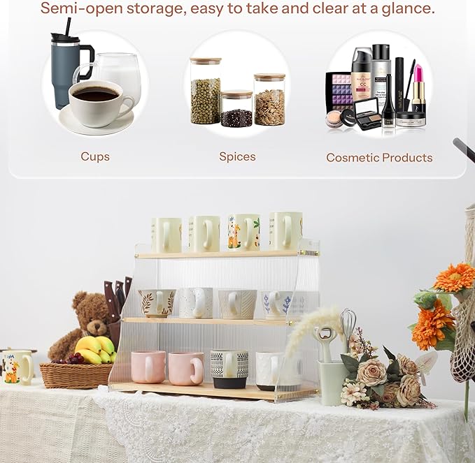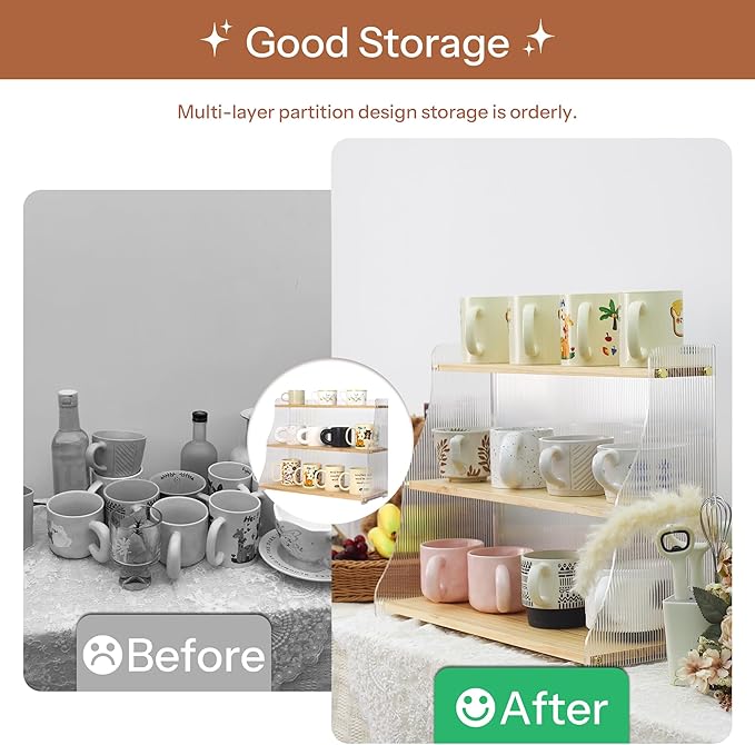 - Stylish Design: Featuring wavy acrylic side panels and a natural wood board. The sturdy construction ensures that it can hold the weight of multiple mugs without wobbling or tipping. this organizer presents an aesthetically pleasing texture, ideal for coffee bar enthusiasts and those who love to decorate their spaces.