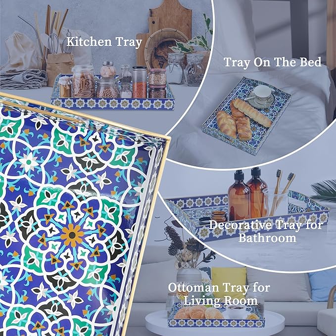 - 【Multipurpose Serving Trays】Designed for display and storage, this floral blue serving tray can be used as a decorative tray, makeup tray, jewelry tray, service tray and desktop organization tray.This serving tray can also be used as a storage box for small items such as keys or TV remote controls. Also perfect for serving snacks, breakfast lunch or dinner.