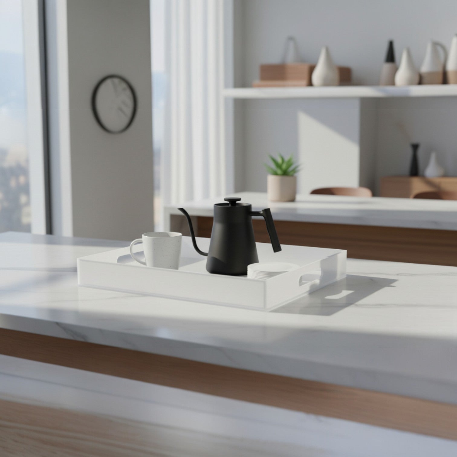 - MULTIPURPOSE ORGANIZER: Our tray can hold coffee, food, tea, fruit, snacks, appetizers, desserts, and drinks at the bar, kitchen, or party according to your needs. Additionally, it can also function as a vanity tray for bathroom, counter, or dresser tops while doubling up as an organizer for remote controls, magazines, makeup, toiletries, and more. Its adaptable design makes it a suitable addition to kitchens, bathrooms, vanity areas, and bars.