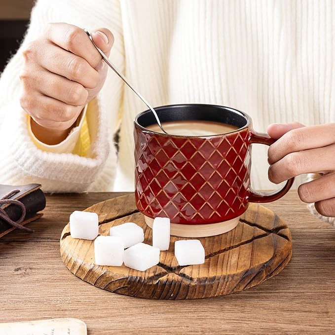 - Stackable and Modern Design: These ceramic mugs feature a beautiful embossed texture design, the smooth rim ensures a comfortable drinking experience, the stackable design allows for easy storage and helps save space in your kitchen.