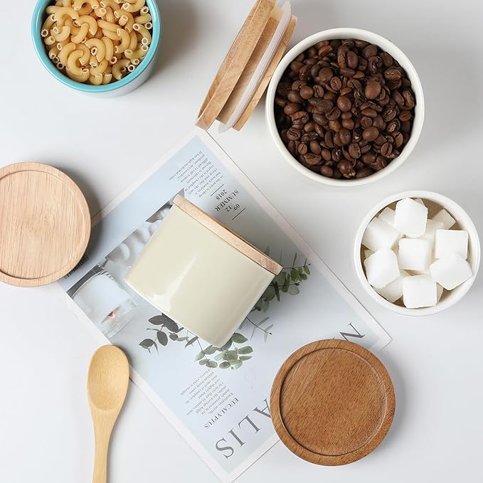 - Ceramic Material - Sweejar food storage containers are made of food grade, smooth porcelain. The containers with wooden lid and rubber seal to ensure a true airtight seal and lightproof. They are good for maintaining food and seasoning fresh.