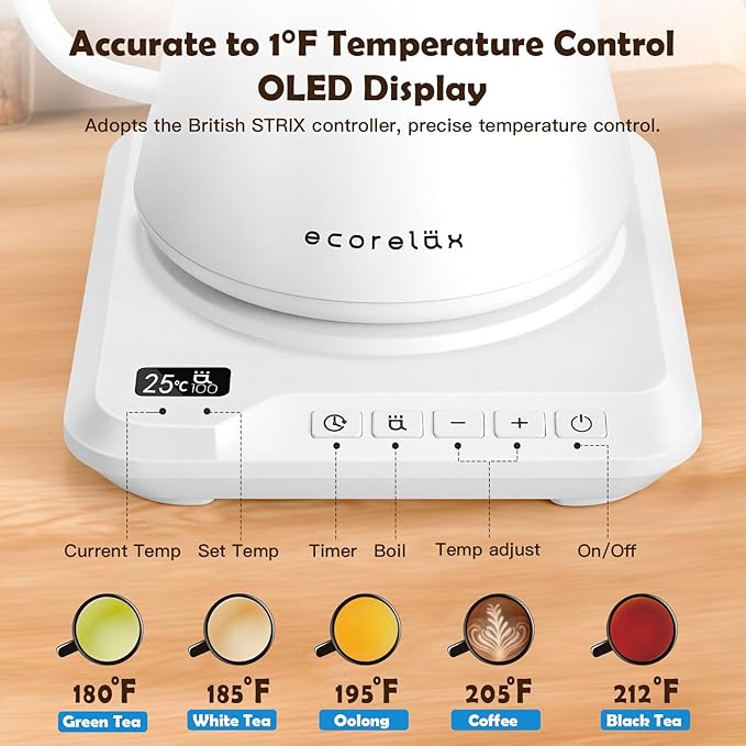 - Precise Temperature Control: Ecorelax electric temperature control kettle adopts the British STRIX controller, precise temperature control; OLED display shows the current and set temperature