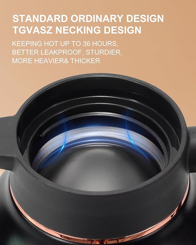 - 【HYDRO TRANSFER PRINTING FOR HANDLE & EASY TO USE INSULATED CARAFE 】Our thermos with one-hand pouring your hot drinks come out with ease whether it be hot tea, cold milk, juice or mulled wine. It's safe to touch the stainless steel coffee carafe exterior body either it is a hot or cold beverage inside, as the temperature is locked in and Tea thermal body stays cool.