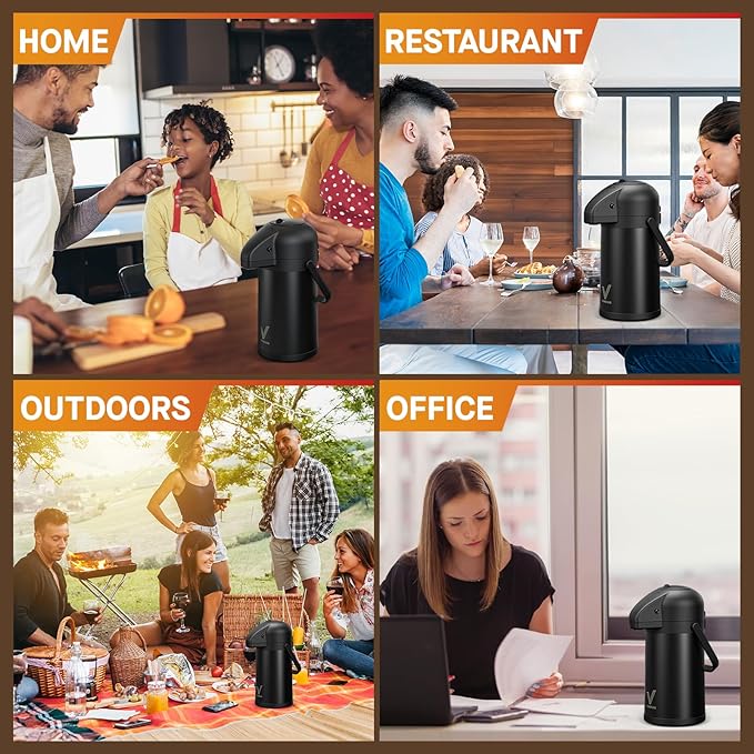 - DISPENSES EASILY AND QUICKLY: With the pump-action top design, this coffee dispenser with pump allows you to dispense your favorite beverage easily and safely with one press without lifting and tilting the entire airport, which greatly prevents the drinks from being overturned or leaked, and friendly to the elder and children.