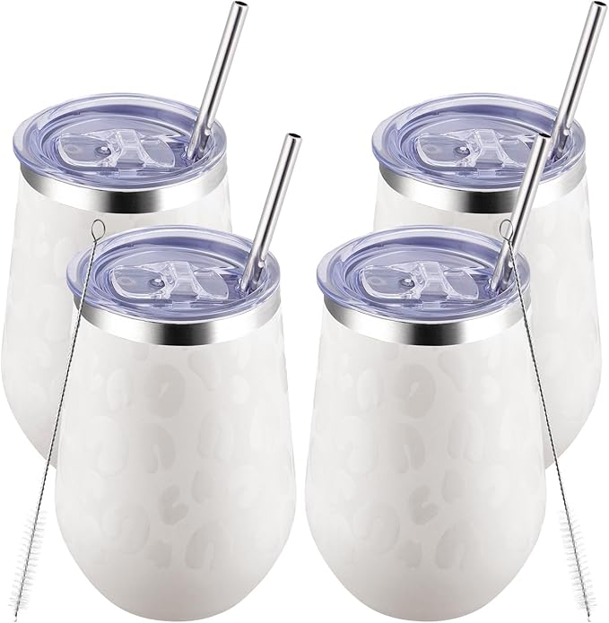 MEWAY 12oz Insulated Wine Tumbler Bulk, Double Wall Vacuum Stainless Steel Travel Tumbler with Straw,Travel wine tumbler, 4 pack of wine tumbler glasses(Almond Leopard,Set of 4)