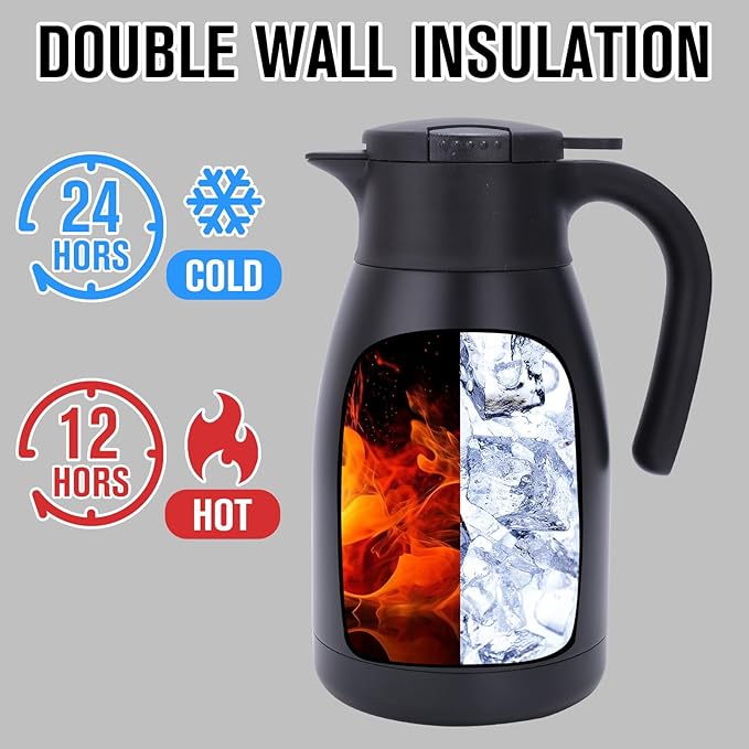 - USER FRIENDLY: GiNT 51oz thermal carafe features extra wide top opening, easy for cleaning and adding ice cubes; Simple-push button enables single-hand pouring without leaking, dripping or spilling; Ideal used for bedside, restaurant, office, party, camping, travel insulated coffee carafes.