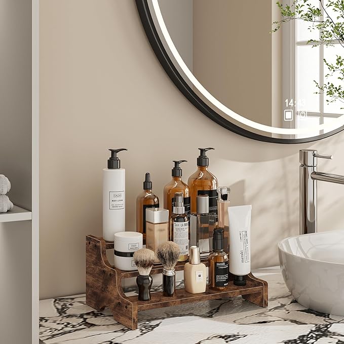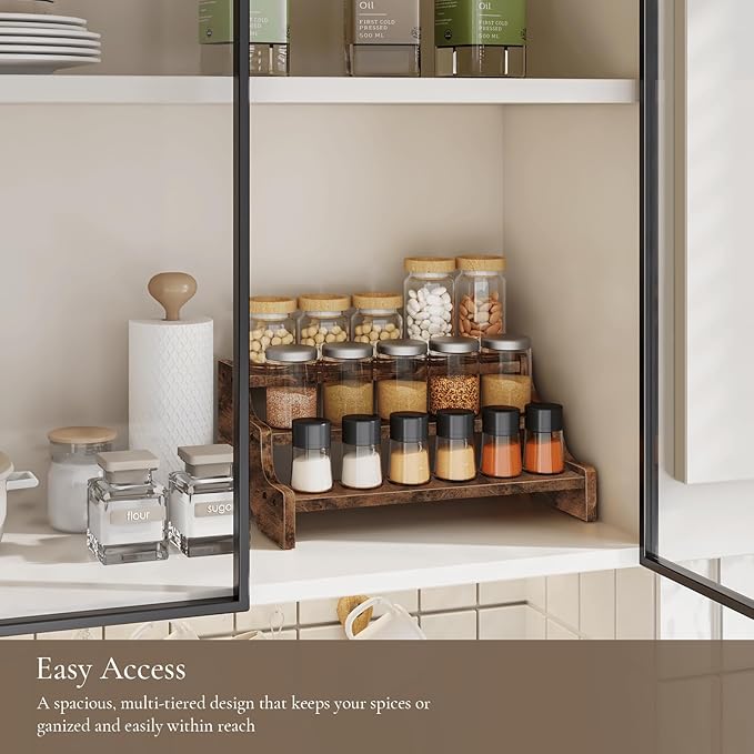 - SPACE-SAVING DESIGN: Measuring 13.8 inches wide, this compact wooden multi-tier shelf stand fits neatly on countertops or shelves, maximizing your counter storage. The raised tiers help to create an eye-catching feature for your items.