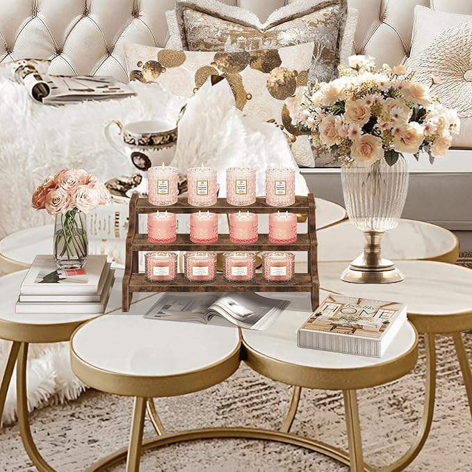 Wooden Display Riser Stand, Tiered Perfume and Cologne Organizer Stand, 3 Tier Spice Rack, Rustic Display Shelf for Candles, Kitchen Storage Holder for Spice Bottles, Jars, Seasonings