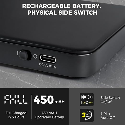- Rechargeable & Energy Efficient: Powered by a larger 450mAh battery, this TYPE-C rechargeable coffee scale lasts longer and charges faster. Auto shut-off after 3 minutes conserves power, while dual activation (side switch + touchscreen) enhances safety and control