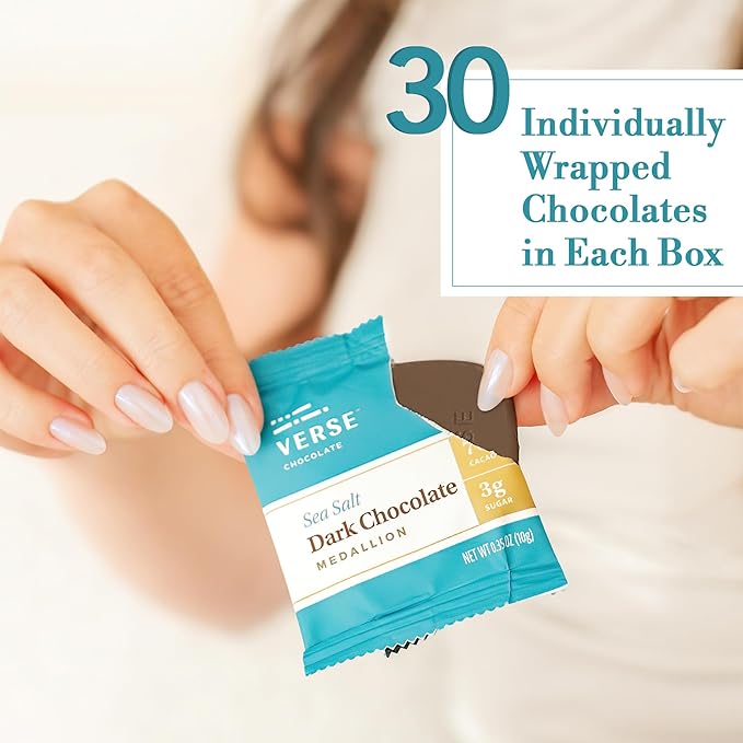 Verse Dark Chocolate Sea Salt Squares - Only 3g Cane Sugar - Creamy 70% Cocoa Dark Chocolate - Individually Wrapped Cacao Bar Squares (30 Count)