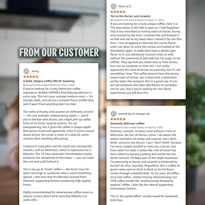 BAZAN COFFEE – Vietnamese Fine Robusta, Premium Medium Roast Whole Bean, Single Origin Specialty Coffee, 100% Natural, Anaerobic Fermented, Tropical Flavor Notes of Durian, Honey & Caramel, 12oz Bag