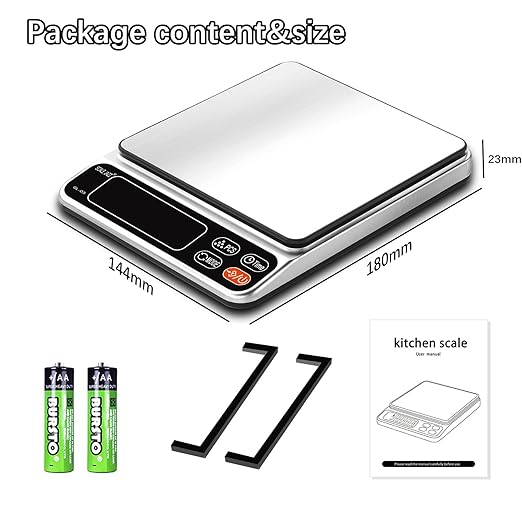 - 5.【Portable Design】 With dimensions of 185×145×25mm, this kitchen scale is compact and easy to carry or store anywhere in the kitchen. (Includes 2 AAA batteries.) Please feel free to contact us if you have any questions