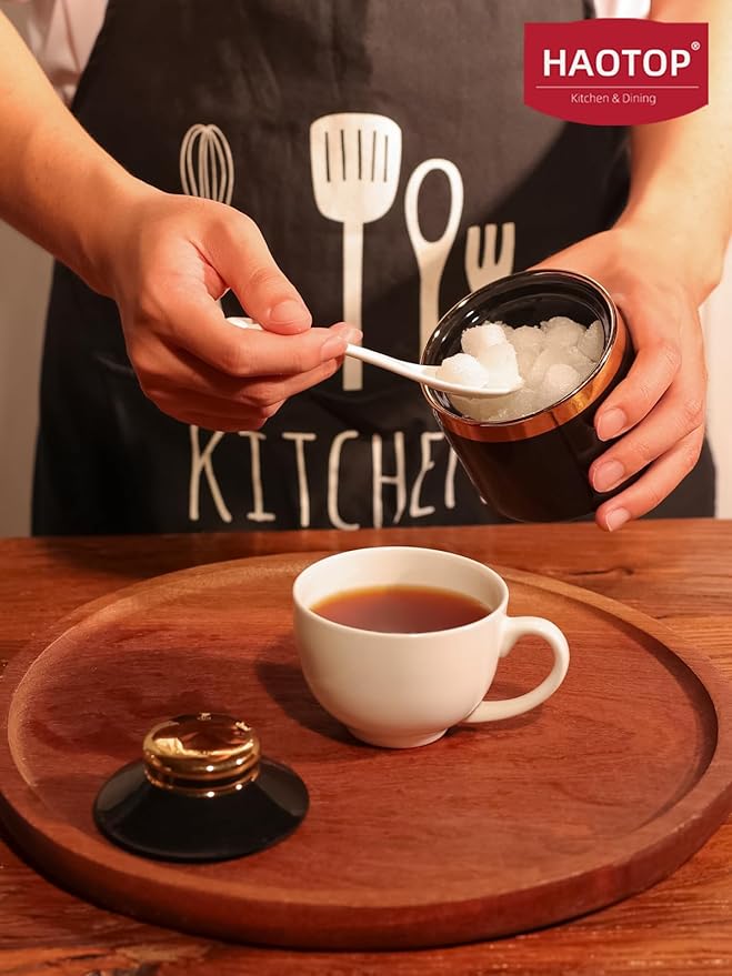 - DESIGN CONCEPT: This simple sugar bowl is equipped with a lid and a small spoon. The lid can keep your ingredients away from dust. There is a perfect notch on the lid for placing the spoon, so you don’t have to worry about placing the spoon randomly