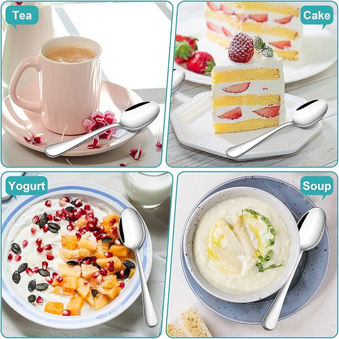 - MULTIPURPOSE: These metal spoons measured 6.7” x 1.4”, Mini size to fit all kinds of tea and coffee cup, Ideal for stirring coffee, tea, milk, soup, Also great as a dining spoon for yogurt, pudding, cake, ice cream, jelly, Can be widely used in formal and informal occasions, Such as family, restaurant, hotel, canteen and café and more