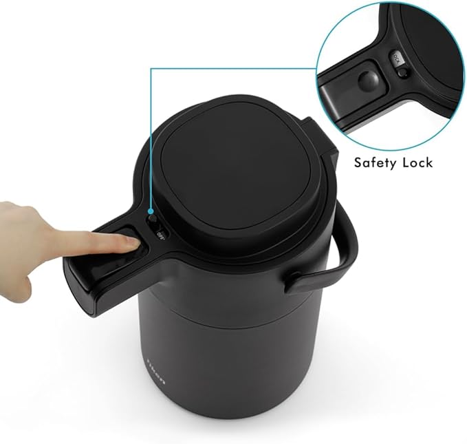 - Sleek Design and Sturdy Construction: Made from high-quality 18/8 stainless steel interior and exterior, this stylish airpot coffee dispenser with pump is sturdy and well insulated. With the sleek and modern look, the hot drink dispenser is a must-have addition to your coffee setup. It also features a safety lock that helps prevent drips and overflow.