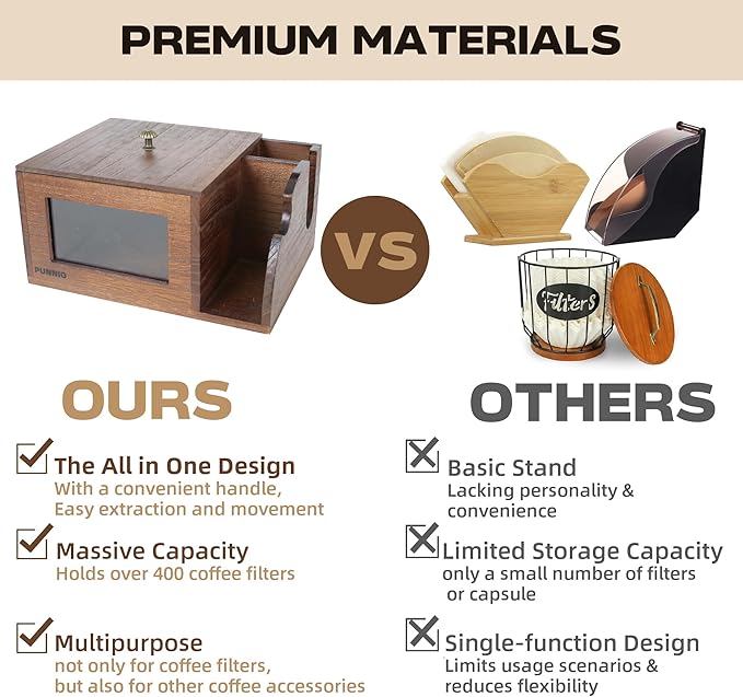 - Space-Saving Solution: Featuring a compact design, our coffee filter storage maximizes counter or cabinet space, keeping your kitchen tidy and organized. Its sleek profile allows for easy access to filters, streamlining your brewing process while reducing clutter. Perfect for maintaining an efficient coffee station without sacrificing style.