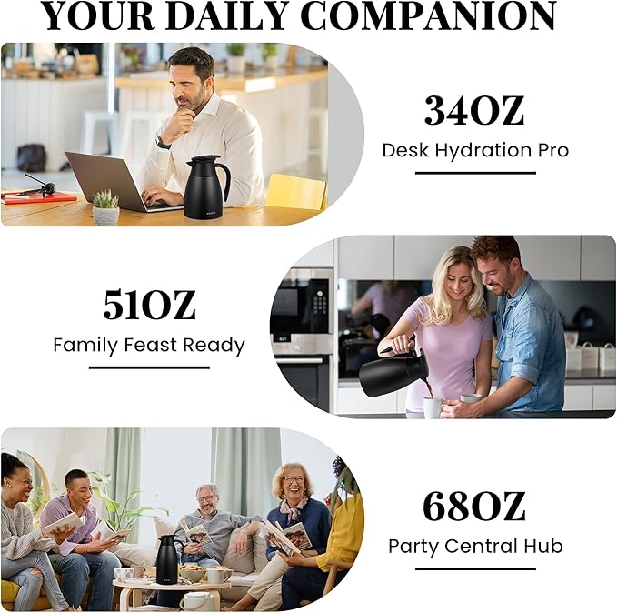 - Long-Lasting Vacuum Insulation: This thermal coffee carafe (68 oz / 2 L) uses advanced vacuum insulation to minimize heat transfer. Perfect coffee carafes for keeping hot drinks 12 hours or cold drinks 24hrs, ideal insulated coffee carafe for optimal retention