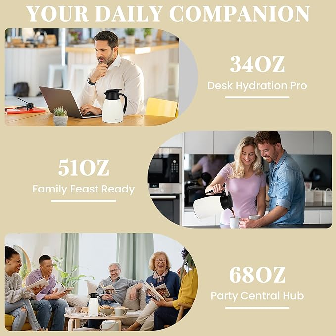 - Versatile & User-Friendly:Large coffee carafe (34 oz / 1 L) suits gatherings/offices. Pre-heat/pre-chill to keep coffee hot/cold longer. Sleek iced coffee carafe & hot tea thermos in one