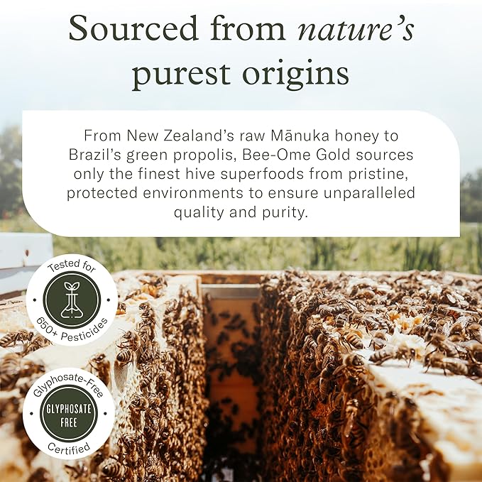 - Naturally Nutrient-Dense - Infused with organic royal jelly and bee pollen, Bee Ome Gold contains naturally occurring B vitamins, amino acids, and enzymes—whole-food nutrition in golden form.