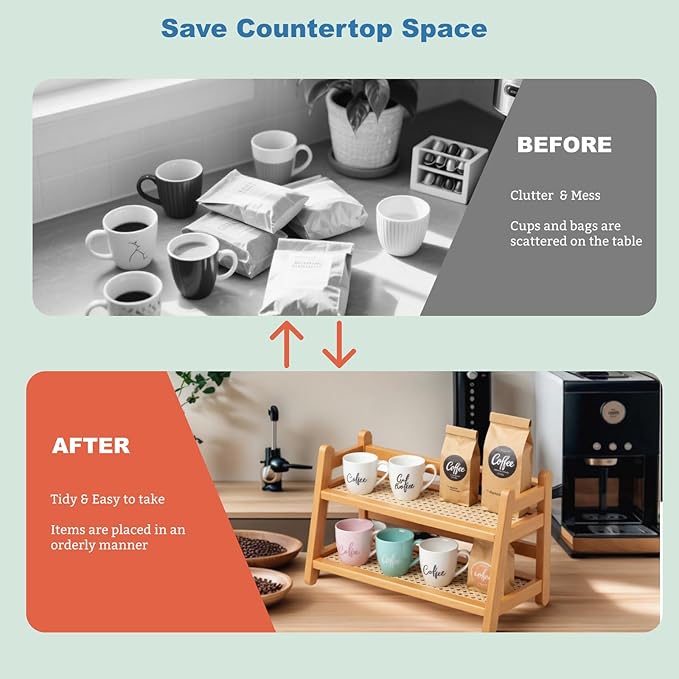 - Double-Tier: Open-shelf design holds up to 8-10 standard mugs. Lower tier offers 5.1 inches of vertical space for taller containers, such as Seasoning bottles, snacks, while the upper tier's 3.2-inch raised edge helps items from sliding, enhancing safety and versatility.