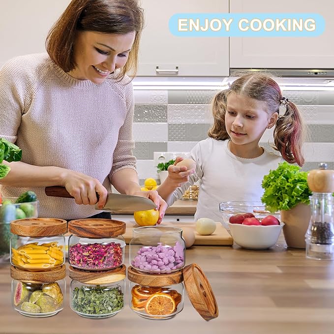 - - 【WIDE APPLICATIONS】 Small glass canisters for pantry organization are suitable for storing various dried ingredients to retain their freshness, with clear glass jars, you can easily see inside and quickly find the ingredients you need.Glass jars with wood lids perfect for storing dry food , such as,cookies,dried beans,pepper, oatmeal,jams, chutneys, rice, flour, tea, coffee, biscuits, candy,cheese,flour, sugar, seeds,etc. Keep your kitchen tidy and safe,saving space and convenient .