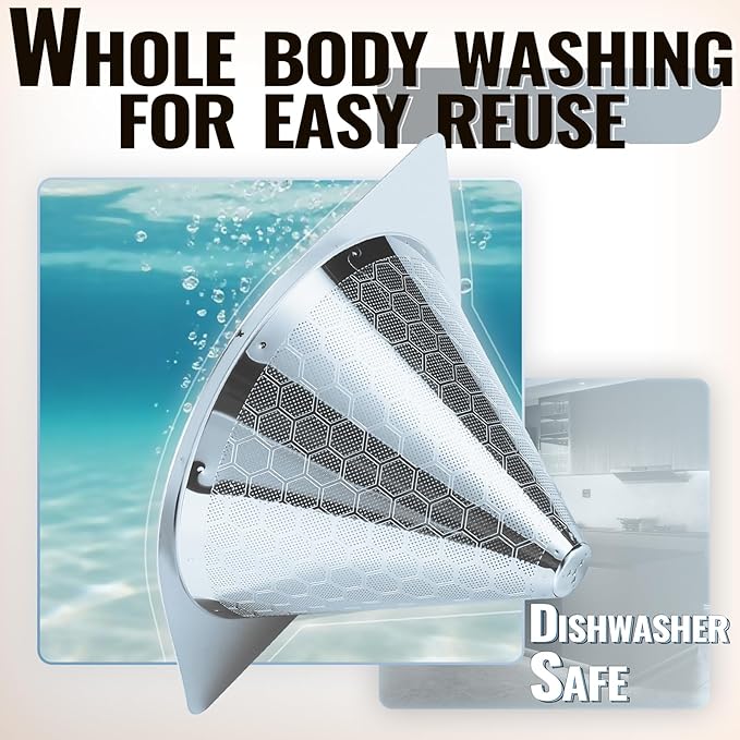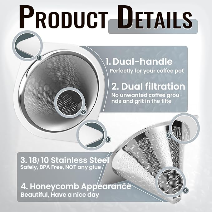 - ☕【GREAT TASTE EXPERIENCE】These stainless steel filters have double-layer mesh with holes sized for filtration, which perfectly leaving coffee grounds and grit in the filter.The cone coffee filter allows the natural coffee bean oils and nutrients to filter extraction to your cup while eliminating the paper taste from traditional filters. It's a perfect brewing solution