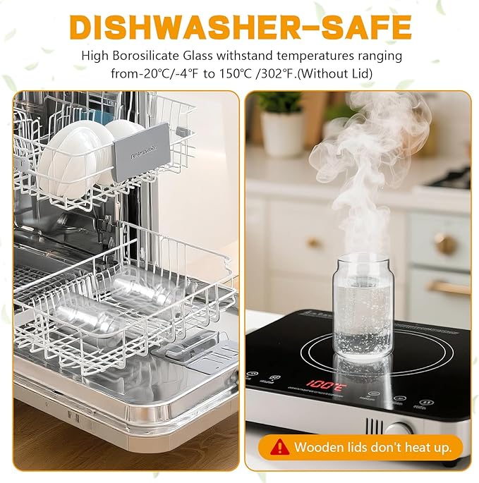 - 【MATERIAL & QUALITY】: Small Glass jars made of high-borosilicate glass With the advantages of high temperature and low temperature resistance,Can burn directly on induction cooktop, withstand temperature range 150℃ /302°F to -20℃/-4°F( wood Lid can not be covered, if in a hot environment.)Glass food storage containers with lids can be used in the refrigerator .