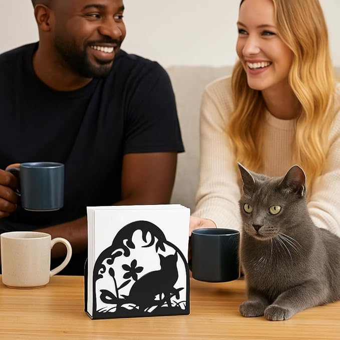 Decorative Metal Napkin Holder Set – Cat & Floral Design – 2 Sizes for Everyday & Cocktail Napkins – Black Modern Kitchen Coffee Filter Holder for Size #2 & #4 coffee filters.